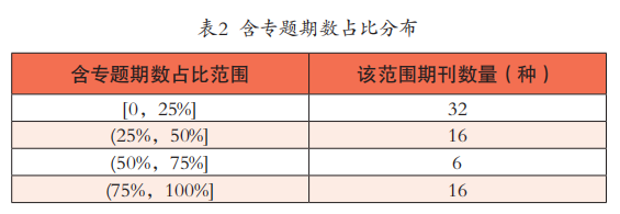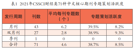 就两项指标横向对比来看,月刊与双月刊的差别很小,基本处于同一水平。以月刊、双月刊、季刊刊数占比作为权重,计算得到全样本结果(表1最后一行所示)显示:2021年全年,每种财经类核心期刊平均策划4.6个选题,平均每种期刊在38.7%的刊期上策划了专题,平均每种期刊专题文章占总文章篇数为8.5%。