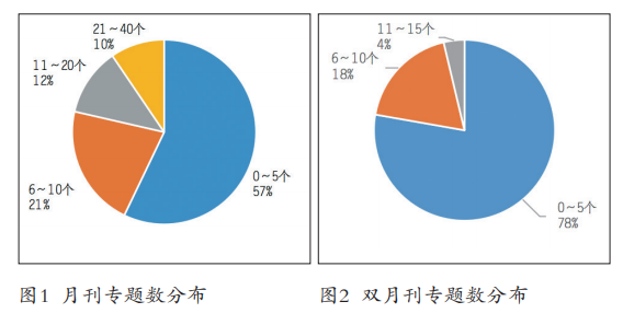 2.专题分布测算。月刊与双月刊的论文刊载总量不同,专题数量也必然不同,故分类讨论。图1所示43种月刊中,2021年全年专题策划数0〜5个的期刊占比为57%,6〜10个的期刊占比为21%,11〜21个的期刊占比为12%,21〜40个的期刊占比为10%。图2所示27种双月刊中,2021年全年专题策划数0〜5个的期刊占比为78%,6〜10个的期刊占比为18%,11〜15个的期刊占比为4%。