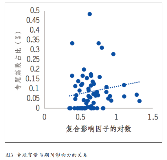 通过计算每种期刊含专题期数占该期刊总期数的比值,可以把发行周期不同的期刊进行比较。如表2所示,含专题期数占总期数比值在[0,25%]区间内的期刊数量为32种,这一比值在(25%,50%)、(50%,75%)和(75%,100%)区间内的期刊数量分别为16种、6种和16种。结合图1、图2、表2,笔者发现,财经类核心学术期刊中,专题策划量贫乏的期刊仍然属于大多数。这些期刊对政治主题专题策划理解不深、认识不够,导致专题策划态度应付、方式机械。值得一提的是,为观察71种财经类学术期刊的专题篇数占比与期刊复合影响因子的关系,将复合影响因子取对数之后,对两项指标做散点图,如图3所示。两项指标呈现明显的正相关趋势,即期刊学术层次越高、刊载学术论文被引用量越多,就越倾向于积极策划专题,扩大专题文章容量,展现学术品位,进一步提高影响力。
