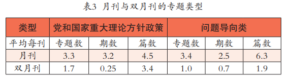 分析表3发现,月刊与双月刊在专题类型的呈现上具有一定差别。横向比较党和国家重大理论方针政策专题和问题导向类专题:月刊中,前者不论是在专题数还是文章数上都低于后者;双月刊中,前者的专题数和文章数均高于后者,说明刊期不同的期刊在专题侧重上各有不同。可能是因为,财经类学术期刊问题导向类专题稿源更多、组稿更易;党和国家重大理论方针政策需要专门约稿,组稿周期较长,所以刊期短的月刊倾向于策划问题导向型专题。