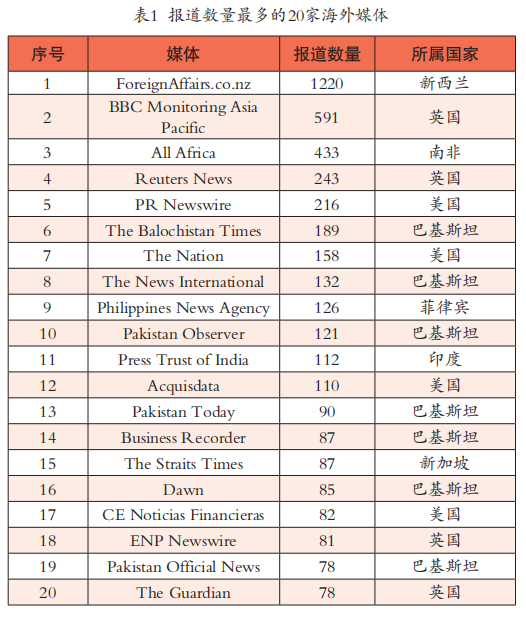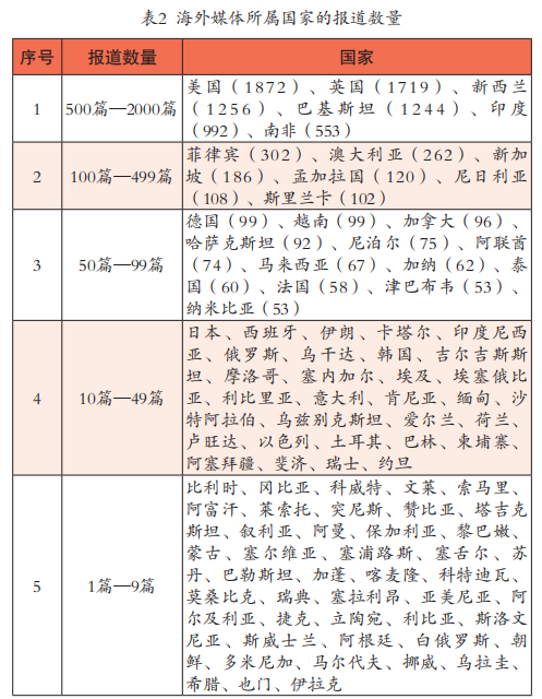 从海外媒体主体角度来看,共有967家海外媒体参与了中国脱贫攻坚报道。表1梳理了报道数量最多的20家媒体信息,发达国家和发展中国家各占据10家。发达国家方面,美国和英国各占据4家,新西兰1家,新加坡1家,其中包括英国广播公司(BBC)、路透社(Reuters)、卫报(The Guardian)等老牌西方报刊。发展中国家方面,巴基斯坦媒体最多,占据7家,南非1家,菲律宾1家,印度1家,这些媒体在各自所属区域大多具有广泛的影响力。从报道媒体所属国家或区域来看,共有97个国家的媒体对中国扶贫工作进行了报道,其中发达国家24个,发展中国家共73个(见表2)。报道数量在500篇~2000篇的国家包括美国、英国、新西兰、巴基斯坦、印度和南非,这六个国家的报道数量远超其他国家。在报道超过100篇的12个国家中,有5个发达国家和7个发展中国家。综合来看,中国脱贫攻坚战的理论与实践经验在发达国家和发展中国家中都获得了广泛关注,在国际社会引起了强烈的反响。