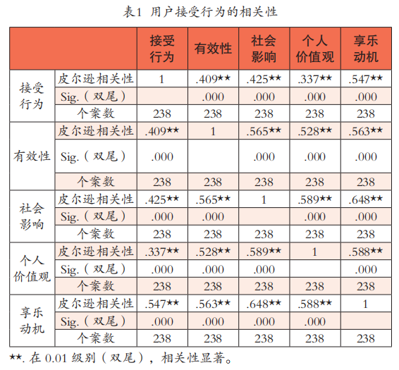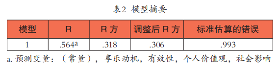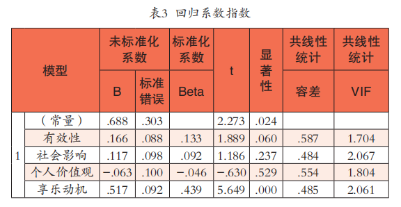 上述分析证明受众的接受行为受到了有效性、社会影响、个人价值观、享乐动机这四个因素的影响,但这四个因素之间的关系形式并未得到显示。为此,本文采用多元线性回归进一步分析相关性结果。